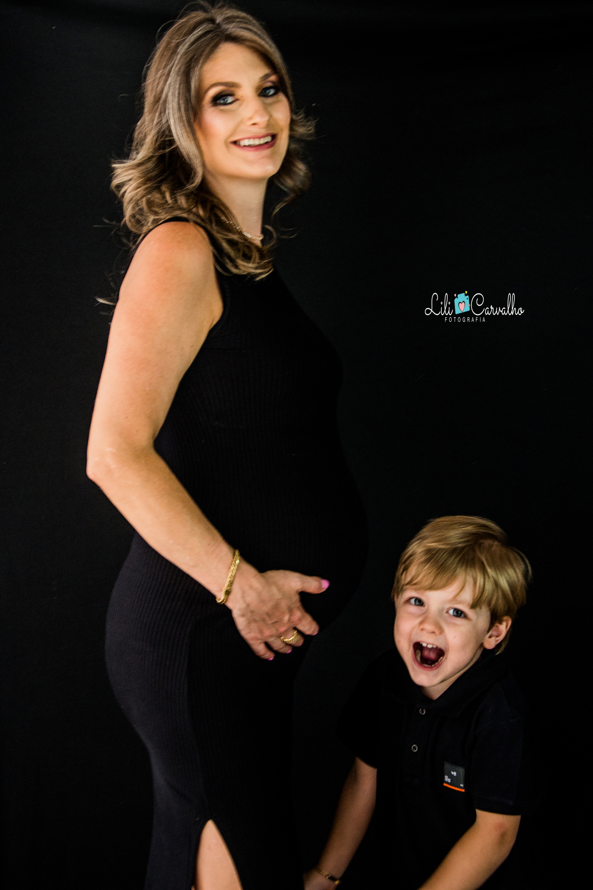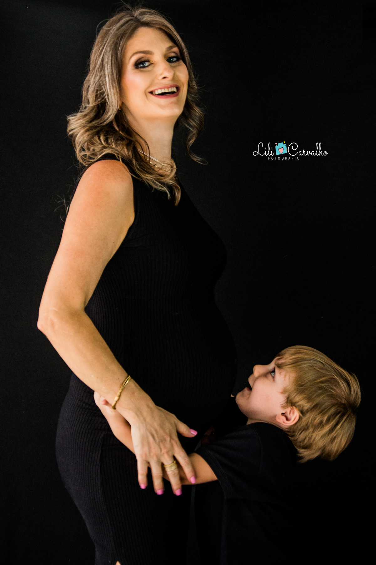 fotografia de gestante no estudio em Maringá filho sorrindo