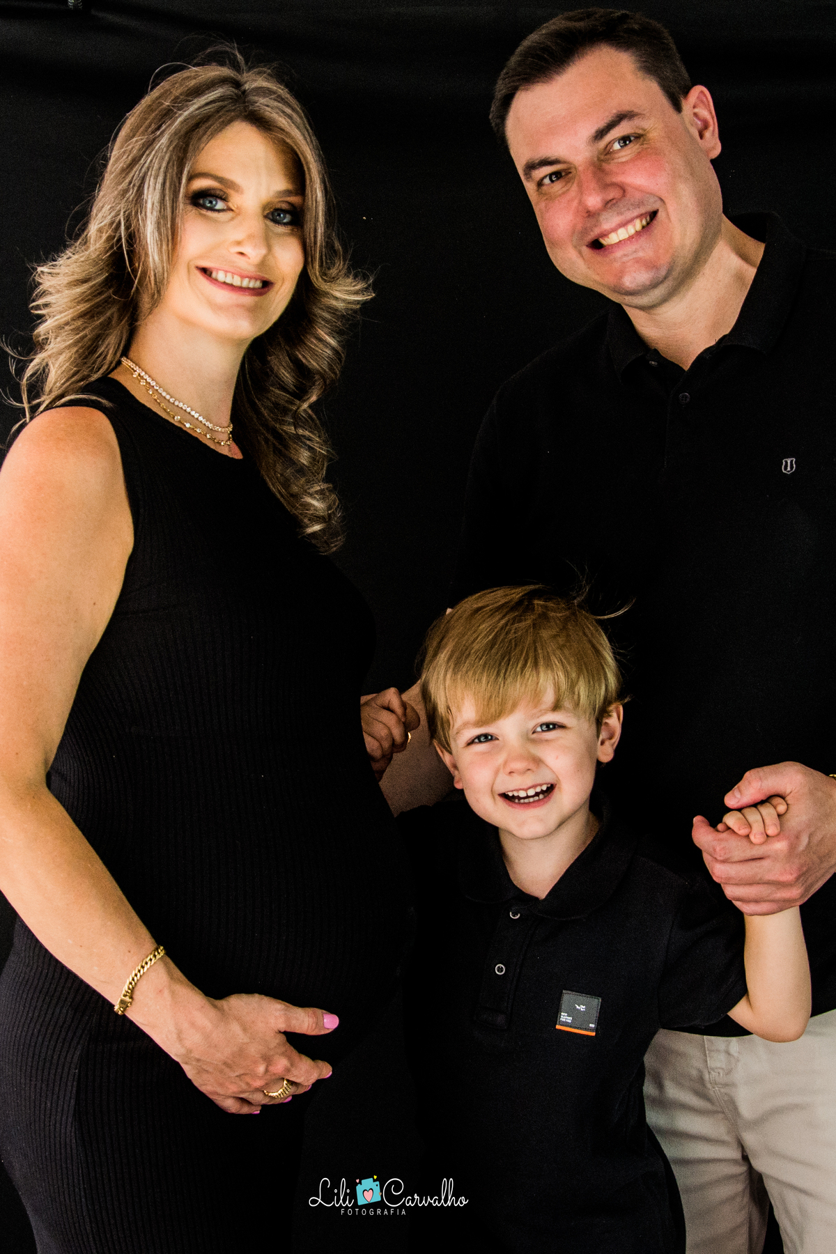 fotografia de gestante no estudio em Maringá casal com filho pequeno