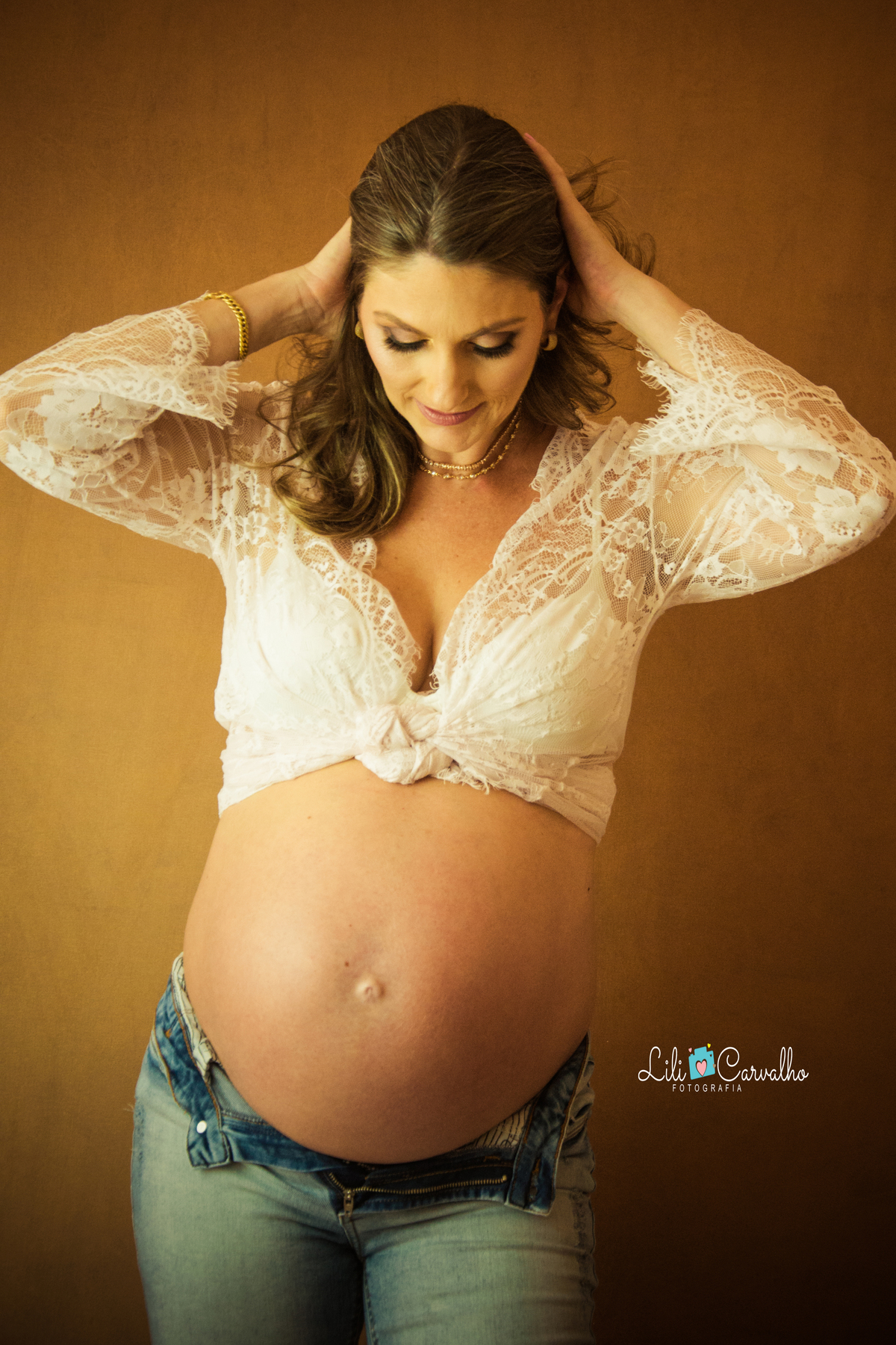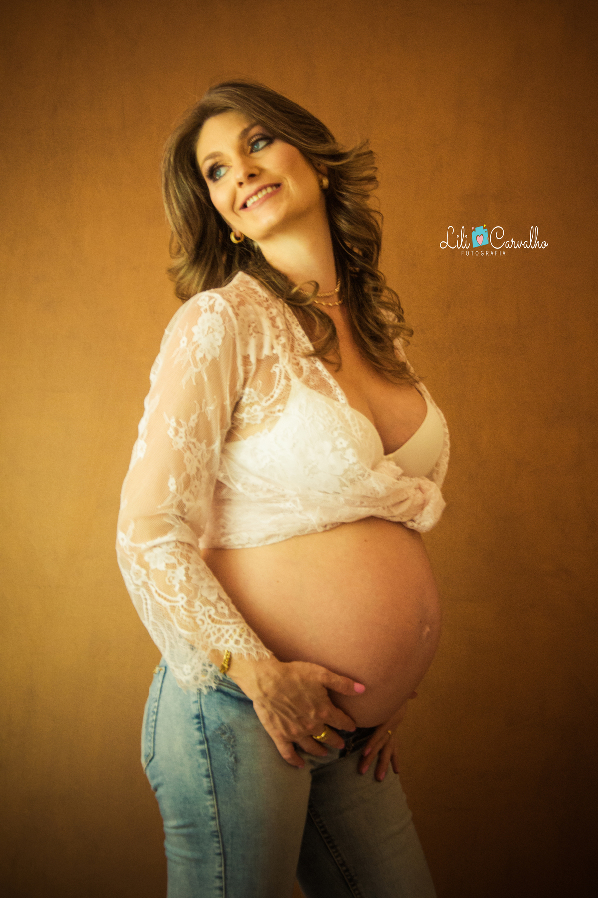 fotografia de gestante no estudio em Maringá lingerie branca