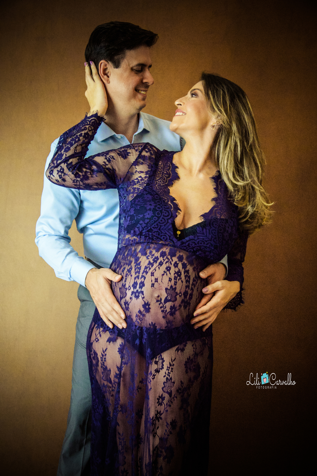 ensaio fotografico de gestante em Maringá, vestido azul de renda, romance